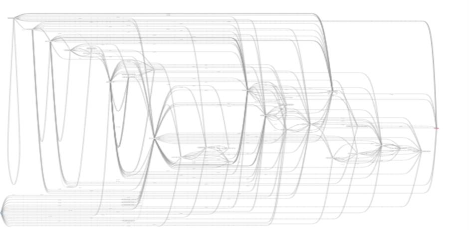 프로세스 마이닝이라는 학문은 워크플로우 관리에 기반하여 시작된 이론이기 때문에 아직은 고객 행동 분석 측면에서의 접근이 생소하실 수 있습니다. 또한 고객의 행동은 일반화하기 어렵고 보편적으로 고객 한 명 한 명이 서로 다른 여정을 그리기 때문에 여러 명의 고객 여정을 그룹화하기 쉽지 않습니다. 실제로 고객의 행동 로그 데이터를 아무런 정제 없이 프로세스 마이닝 솔루션을 활용하여 맵을 그려보면 아래와 같은 복잡한 맵이 나타나게 됩니다.