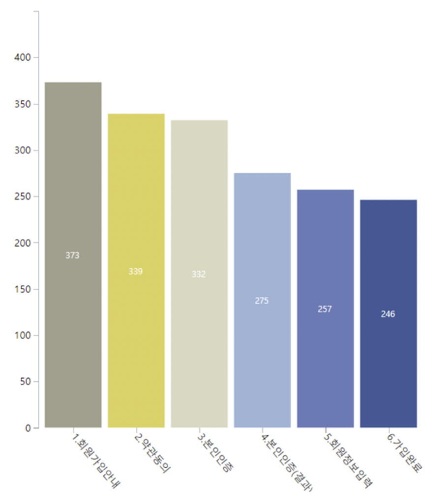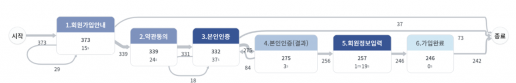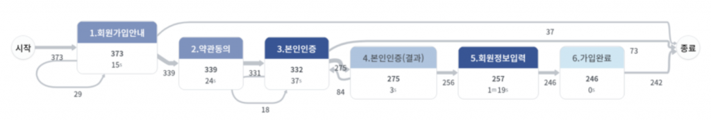 실제로 단계별 진입 고객 수를 확인해 보면 타 단계에 비해 3단계 후 이탈폭이 큰 것을 확인 가능 합니다. 이를 통해서 해당 구간을 pain point로 볼 수 있습니다. 따라서 해당 단계에서 이탈이 많이 발생하고 고객이 본인인증에 어려움이 있다는 점을 발견했으니 해당 페이지를 고객이 쉽게 이용이 가능하도록 변화를 주거나 본인인증 수단이 다양하지 않다면 다양한 방법을 추가하는 등 고객 경험 프로세스의 개선 방안을 생각해 볼 수 있겠습니다.