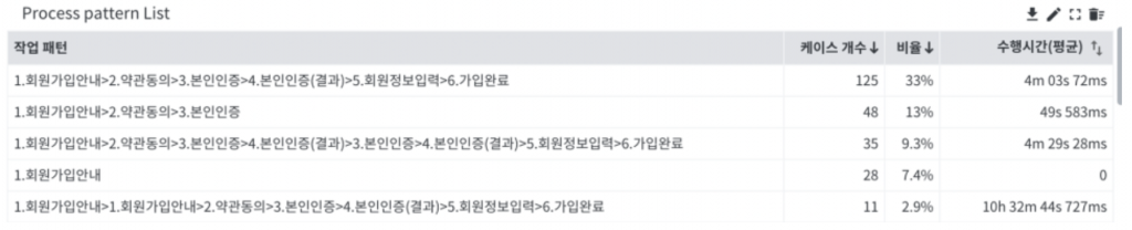 프로세스 패턴 리스트를 통해서 알 수 있는 사실은 큰 흐름을 볼 수 있는 빈도 기반 맵과는 달리 패턴과 수치를 보고 좀 더 직관적으로 확인할 수 있다는 점입니다. 이를 통해 특정 패턴을 가진 고객별로 관리 및 마케팅 프로세스를 달리 가져가는 방안 모색이 가능합니다.