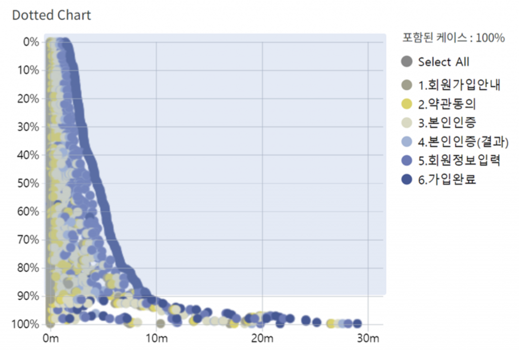 (Dotted Chart 해석 방법 : 일련의 점을 가로 방향을 기준으로 좌측부터 우측 끝까지(=1단계 회원가입안내부터 6단계 가입완료)를 시간의 흐름에 따라 좌표에 나타낸 것이라 보시면 됩니다. 그리고 0m(분)이 1단계를 시작하는 시점으로 해당 시점에 고객이 1단계(회원가입안내)를 수행한 것이고 우측 끝 점의 x좌표를 최종 수행 시점으로 개념을 잡으시면 됩니다. 예를 들어 y축 50%의 근방에 있는 고객들은 1단계부터 6단계까지 약 5분 정도 소요한 것으로 이해하시면 됩니다.)