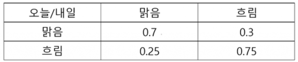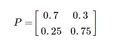 이를 아래와 같은 전이확률 행렬로 표현할 수 있습니다.