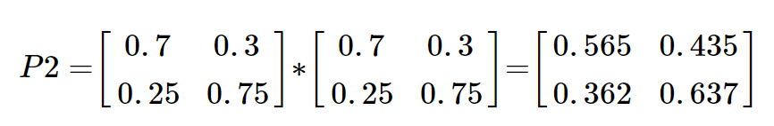 위의 전이 흐름도를 가지고 계산을 했을 때 행렬곱을 통하여 아래와 같이 계산할 수 있습니다. 다시 말해 모레의 확률 변화는 오늘과 내일의 전이가 연속되어 일어나는 경우이기 때문에 전이행렬을 곱하여 계산하게 됩니다.