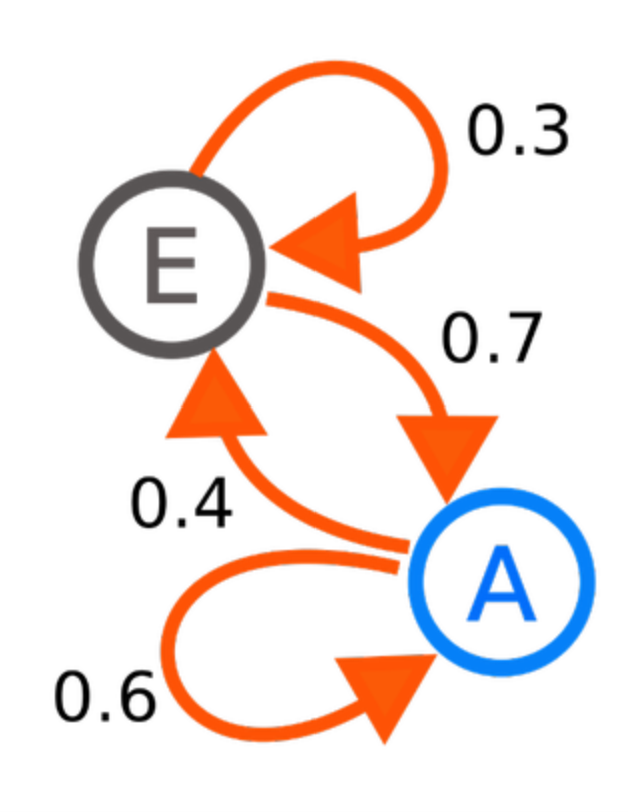 도표에서는 상태 A에서 상태 E로 전이할 확률을 0.4 반대의 확률을 0.7이고 상태 E와 A를 반복할 경우에는 각각 0.3과 0.6으로 보았습니다. 이제 간단한 예제를 통하여 마르코프 체인 계산 방법에 대해 알아보겠습니다.