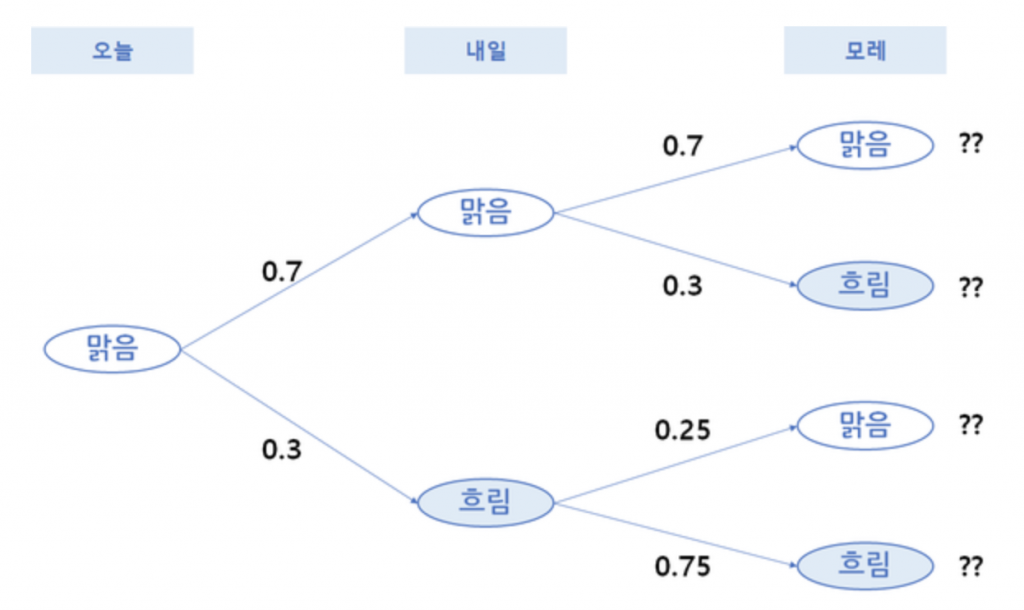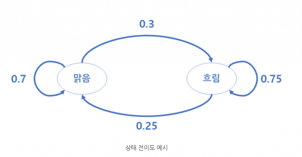 위와 같은 확률이 있을 때 우리는 아래와 같이 상태 전이도를 그릴 수 있습니다. 위의 표와 동일하게 맑음이 내일도 계속될 확률은 0.7, 맑음에서 흐림으로 갈 확률은 0.3 등으로 표현할 수 있습니다.