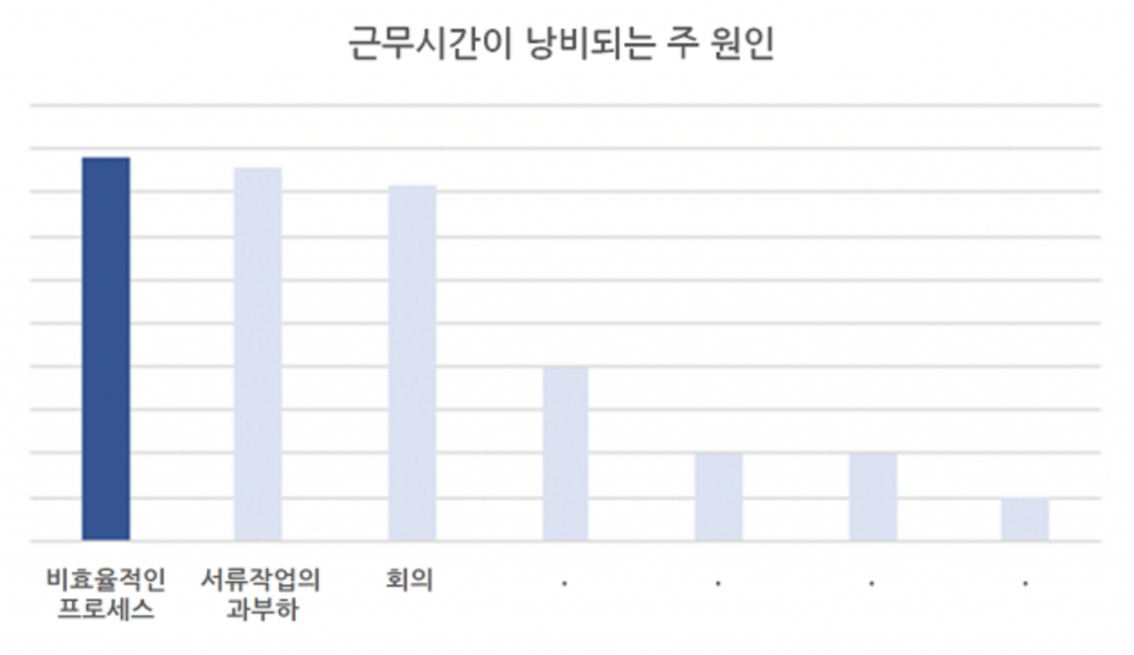 The Powering Productivity research의 연구에 따르면 515개 비즈니스 리더와 각국의 핵심 결정권자들을 대상으로 조사한 결과 핵심적인 경영 이슈로 직장의 비효율성이라고 지적했습니다. 근무시간 중 낭비되는 시간의 주된 원인은 비효율적인 프로세스(44%)로 가장 높게 나타났으며 서류작업의 과부하(43%), 회의(41%) 순으로 나타났습니다.