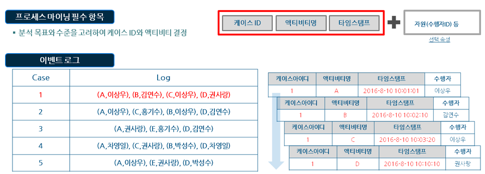 프로세스 마이닝 기법을 적용하기 위해서는 “Event log”를 추출하는 것이 필수적이지만, 많은 데이터 항목이 필요하지는 않습니다. 대부분의 업무 시스템들은 시스템 사용 이력들을 데이터베이스 혹은 파일 로그 등에 남겨놓으며, 이 중에서 추적 대상(케이스)을 결정하고 “누가(수행자)”, “언제(타임스탬프)” “무엇(액티비티명)”을 했는지 만 추출할 수 있으면 프로세스 마이닝을 바로 적용할 수 있습니다.