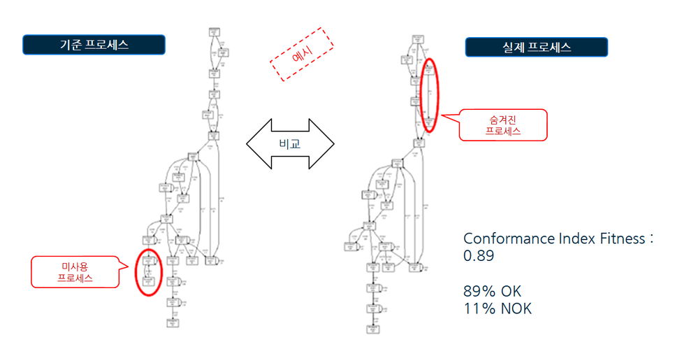 그리고, 두 프로세스 간에 비교를 통해 실제 발생하지 않는 미사용 프로세스나 실제 프로세스에서만 발생하는 숨겨진 프로세스를 찾을 수 있습니다.