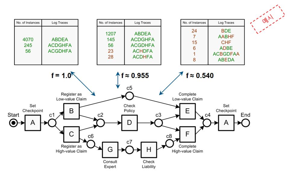 프로세스 마이닝에서 얻어진 프로세스 모델은 주어진 다양한 로그들의 프로세스 패턴을 얼마나 잘 설명할 수 있는지 앞서 설명한 프로세스 적합도를 통해 검증할 수 있습니다.