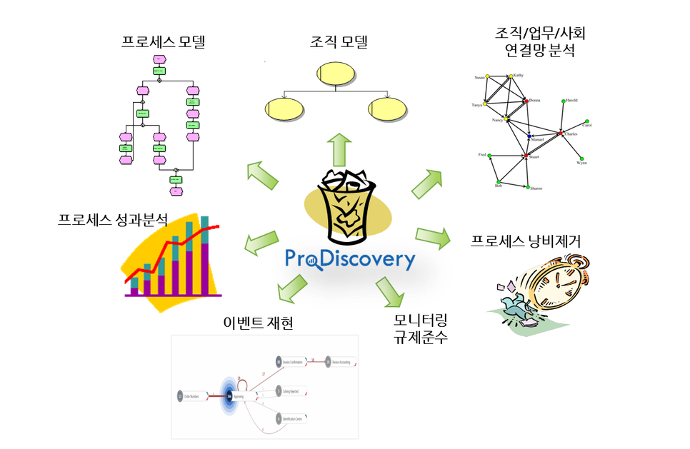 앞서 설명한 프로세스 맵, 조직도, 업무 네트워크 분석 이외에도 이를 기반으로 한 부서별 사용자별 조직 내 성과 분석, 프로세스 내 반복작업, 병목 구간 탐지와 같은 비효율 요인 개선, 이상 프로세스 탐지 등의 규제 준수 등 감사 목적으로 활용됩니다.