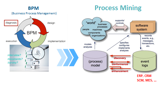 반면에, 프로세스 마이닝은 프로세스 모델을 직접 사람 손을 거쳐 그리는 방식에서 벗어나 이미 구축된 ERP, CRM, MES, Groupware, 웹 기반 업무 플로우 등 각종 업무 시스템으로부터 데이터를 수집하여 End-To-End 전체 프로세스를 자동으로 도출하고 정확한 업무 진단이 가능하게 합니다.
