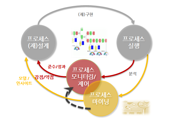 프로세스 마이닝의 역할은 단순히 실제 현실의 데이터를 가져와 프로세스 모델을 그려주는데 그치지 않습니다. 분석을 통해 문제점을 발견하고 이와 관련된 프로세스 요인을 제거하여 실제 세계를 변화시키는 데도 영향을 미치며, 이후 개선된 프로세스의 로그를 다시 수집하여 개선 전후 프로세스를 비교함으로써 객관적인 차이를 검증할 수 있는 수단을 제공합니다. `프로세스 설계 – 실행 – 제어 – 재설계 – …` 의 순환 구조를 가지고 지속적으로 변화하는 프로세스 사이클을 모니터링 함으로써 성공적인 변화 관리를 가능케 합니다.