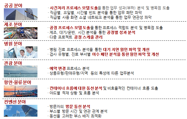 프로세스 마이닝 분석은 프로세스와 이와 관련된 데이터가 존재하는 모든 분야에 적용될 수 있습니다. 공공 서비스의 사건 처리 과정, 다양한 설비 및 단말기로부터 수집된 제조 공정, 병원 외래 환자의 동선 분석, 진료 및 처방 경로 등 다양한 분야에 프로세스 마이닝 분석이 폭넓게 적용될 수 있습니다. 다른 데이터 분석 기법과 마찬가지로 프로세스 마이닝은 각 영역에서의 의사 결정을 지원하고 업무 효율화를 달성하기 위한 수단일 뿐 그 자체가 목표가 될 수는 없습니다. 하지만 각 분야의 도메인 전문가와 협업할 수 있는 데이터 기반의 생생한 프로세스 현장 모습을 제공함으로써 프로세스를 혁신하기 위한 경영 관리 도구가 될 수 있을 것입니다.