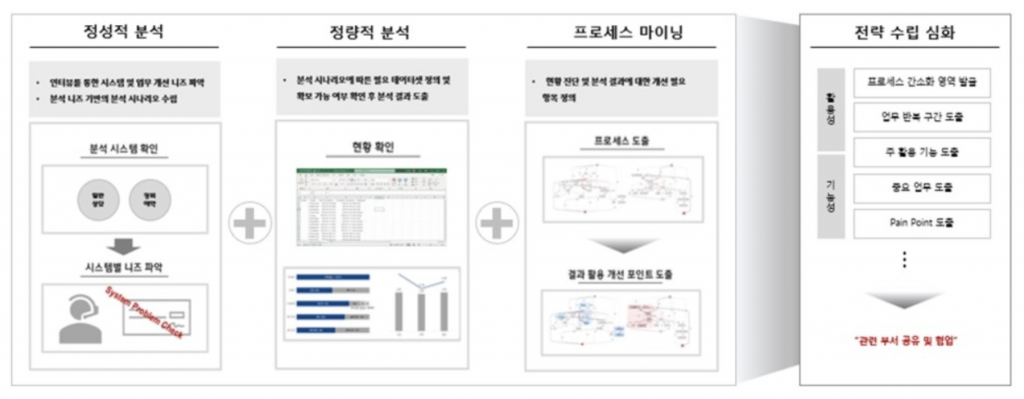[그림1]에서 문제점을 도출하는 방법은 보통 인터뷰 기반인 정성적 방법과 객관적 데이터 기반인 정량적 방법으로 도출합니다. 그러나, 정성적 방법은 업무를 이해하고 문제점을 도출하는데 큰 도움이 되지만 모든 사람의 불만 혹은 의견을 대변하지 못합니다. 또한 정성적 방법으로 얻은 문제점을 사실화하기 위해 많은 인터뷰와 시간이 소요되게 됩니다. 프로세스 마이닝은 이러한 상황을 효율적으로 대체 및 접목할 수 있습니다. 작업자들의 행위가 담긴 로그를 수집하여 프로세스 마이닝을 적용하면 시스템에 대한 문제와 작업자들이 어려워하는 업무가 어떤 것인지 빠르게 잡아 낼 수 있을 뿐만 아니라, 정성적 방법으로 얻은 문제를 프로세스 기반으로 증명할 수 있습니다. ​ 해당 사례에서는 [그림2]와 같이 정성적/정량적 방법과 프로세스 마이닝을 접목하여 UI/UX 전략 수립을 심화하였습니다.