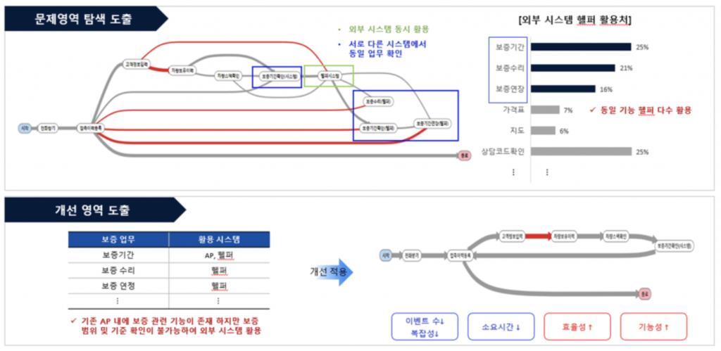 전략 수립 심화를 위해 프로세스 마이닝은 아래와 같이 효율성/기능성 측면으로 분석 결과를 도출하였습니다. 이처럼 프로세스 마이닝은 최적화된 프로세스 및 설계 요소를 제공함으로써, 보다 효율적이고 완성된 To-Be 시스템으로 UI/UX 전략 수립을 심화 및 발전시키는데 활용될 수 있습니다.