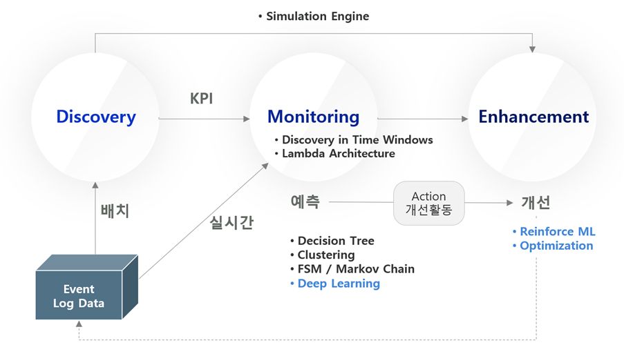 하지만 기존 데이터 기반의 옵저버빌리티는 주로 데이터베이스, 서버, 네트워크 등 인프라 관점의 헬스체크에 초점이 맞췄었다면 프로세스 마이닝은 개발 시스템을 한 곳에 묶어 두고 전체 업무 프로세스 관점에서 건강 상태를 조망해야 합니다. 이를 위해 프로세스 마이닝은 기존에 모델 발견(Discovery) 이외에 모니터링(Monitoring)과 이를 통한 개선(Enhancement) 방법론을 제공하고 있습니다.