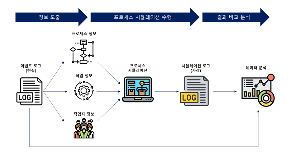 프로세스 개선을 위해 왜 시뮬레이션을 해야 할까요? 현실에서 프로세스 내 업무 흐름이나 자원의 구성을 바꾸기는 쉽지 않습니다. 예를 들어, 병원에서 의사를 한 명 고용했을 때 환자의 대기시간 감소에 얼마나 영향일 미칠 것인지 쉽게 알기 어렵습니다. 현실에서는 고용을 위한 준비와 절차, 그리고 결과가 나올 때까지 기다려야만 효과를 알 수 있습니다. 즉, 상당한 비용과 시간이 소요됩니다. 반면에, 가상 세계에서는 상대적으로 적은 비용과 시간으로 의사 고용에 대한 효과를 확인해 볼 수 있습니다. 그렇다면 어떻게 프로세스 시뮬레이션을 할 수 있을까요? [그림1]을 보면서 하나씩 알아보도록 하겠습니다.
