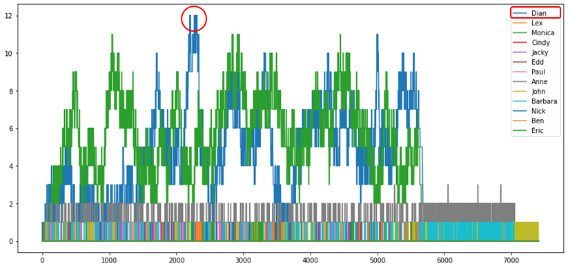 작업자 정보에서 가장 중요한 것은 각 작업자의 업무수행능력(Capacity)입니다. 시뮬레이션에서 업무수행능력이란, 한 작업자가 동시에 수행할 수 있는 작업의 양을 의미합니다. 그리고 작업자는 본인의 업무수행능력보다 더 많은 일을 받았을 때 대기가 발생하게 됩니다. 만약 실제보다 너무 작게 추정하면 현실보다 대기시간이 줄어들 것이고, 반대의 경우 대기시간이 늘어날 것입니다. 이를 추정하는 다양한 방법이 있겠지만 저희는 데이터로부터 각 작업이 시작하고 종료하는 시점을 활용하여 [그림3]과 같이 시간에 따른 작업자 별 부하를 계산하고 최대치를 작업자의 업무수행능력으로 간주합니다. 예를 들어, Dian(파란색)의 업무수행능력은 12개(빨간 동그라미)입니다. 추가로, 작업자 정보에는 업무수행능력 뿐만 아니라 작업자별 근무시간, 비용도 포함됩니다. (비용은 관련 데이터가 존재하는 경우에만 도출합니다.)