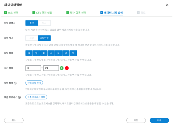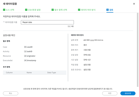 필수 항목 및 데이터처리 옵션은 데이터집합을 생성하고 난 뒤에는 수정이 불가능합니다. 다른 설정을 사용하고 싶으면 다시 원본데이터를 기준으로 새 데이터집합을 생성하면 됩니다. 여러 유형으로 데이터집합을 생성 후 비교해볼 수 있는 기능을 제공하기 때문에 간단하게 여러 방법으로 설정을 할 수 있습니다.
