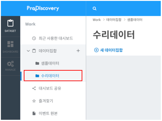 생성한 “수리데이터” 폴더를 선택하여 이동 후 “새 데이터집합” 버튼을 누르면 데이터 집합 등록 화면이 표시됩니다.