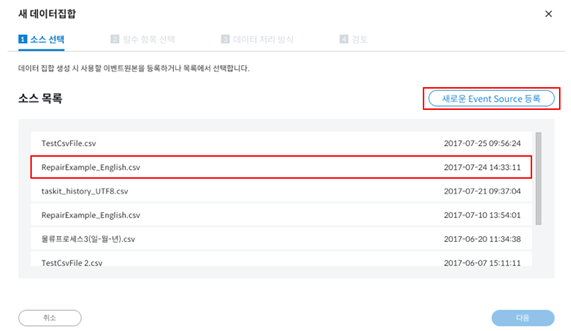 “새로운 Event Source 등록” 을 통해 PC에 가지고 있는 CSV 파일을 등록하거나 이미 기존에 등록했던 파일들 중 선택해서 진행할 수 있습니다.