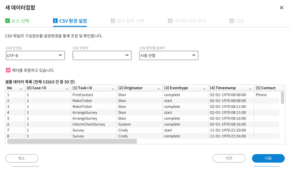 CSV 환경 설정을 마치면 해당 설정을 바탕으로 샘플데이터를 읽어오게 됩니다.