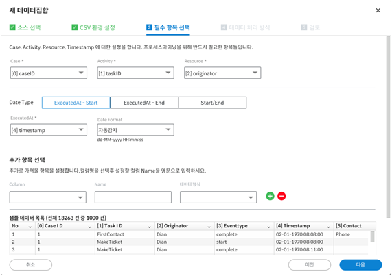 원본데이터를 프로세스마이닝 하기 위한 ‘필수 항목 선택’을 진행합니다.