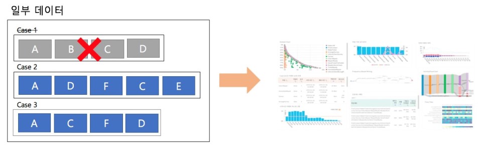 데이터 셋을 생성했다면 이제는 분석을 해볼 차례입니다. 여러 가지 퍼즐들을 통해 원하는 프로세스 관점에서 데이터를 살펴보고 분석할 수 있습니다. 하지만, 전체 데이터에 대한 통계/분석의 결과이기 때문에 때로는 원하는 프로세스의 문제점을 발견하기 어려울 수도 있습니다.