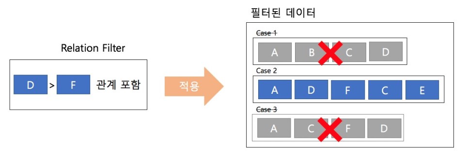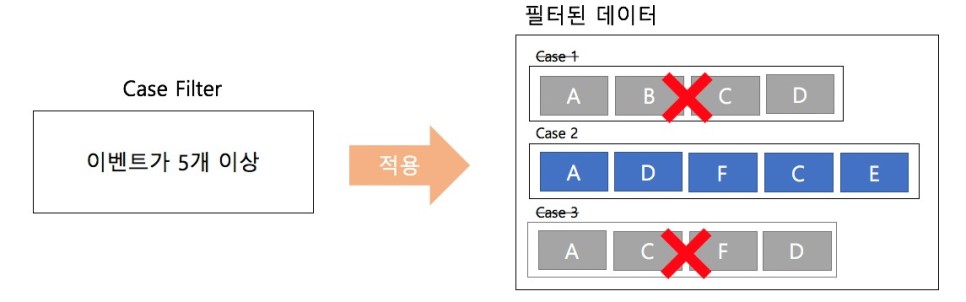 프로디스커버리에서는 다양한 형태의 케이스를 도출할 수 있도록 하기 위해, 크게 3개의 필터(Event, Relation, Case)로 나누어 구성했습니다. 이를 통해서 쉬우면서도 세분화된 필터를 정의할 수 있습니다.