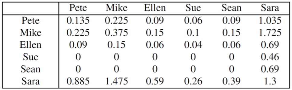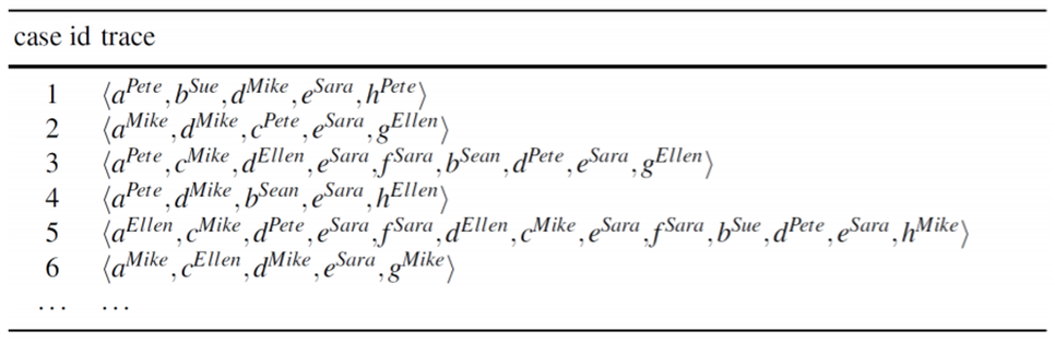 [그림 1]의 이벤트 로그를 이용하여 [그림 2]와 같은 작업자-액티비티 매트릭스를 작성할 수 있습니다. 작업자-액티비티 매트릭스에서 한 셀의 값은 케이스당 해당 액티비티를 특정 작업자가 수행한 비율을 나타냅니다. 예를 들어 [그림 2]의 액티비티 a열의 내용을 보면 a열의 총합 1(0.3+0.5+0.2)은 케이스당 액티비티 a가 평균 1회 발생하는 것을 의미하고, 액티비티 a는 오직 Pete, Mike, Ellen만이 작업하고 그 비율은 Pete 30%, Mike 50%, Ellen 20% 임을 알 수 있습니다. 액티비티 e의 경우에는 Sara만 수행하고, 케이스당 평균 2.3회 수행되는 것을 의미합니다. 즉 액티비티 e는 한 케이스당 여러 번 발생하는 것을 알 수 있습니다. 작업자 관점에서 보면 Sean은 액티비티 b만 수행하고, Sara는 e와 f만 수행하고 있습니다.