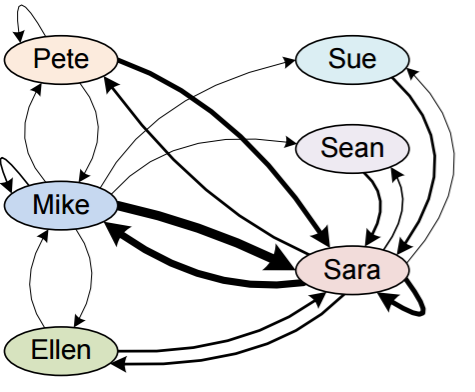 작업자와 작업자를 연결하는 화살표는 작업을 넘겨주는 관계를 표시하며, 화살표의 두께는 작업 전달 빈도를 나타냅니다. Mike와 Sara의 경우 서로 두꺼운 화살표로 연결되어 있어 두 작업자 간의 업무 전달 빈도 수가 높고 업무 연관 관계가 높음을 알 수 있습니다. Sara의 경우 모든 작업자와 연결되어 있어 핵심 업무 수행자일 수도 있고 모든 프로세스의 공통 업무를 담당하고 있을 수도 있습니다.