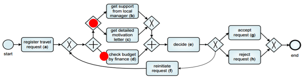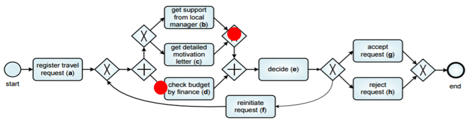 적합도 검사의 기본 아이디어는 프로세스 모델 위에 이벤트 로그를 재생하는 것입니다.