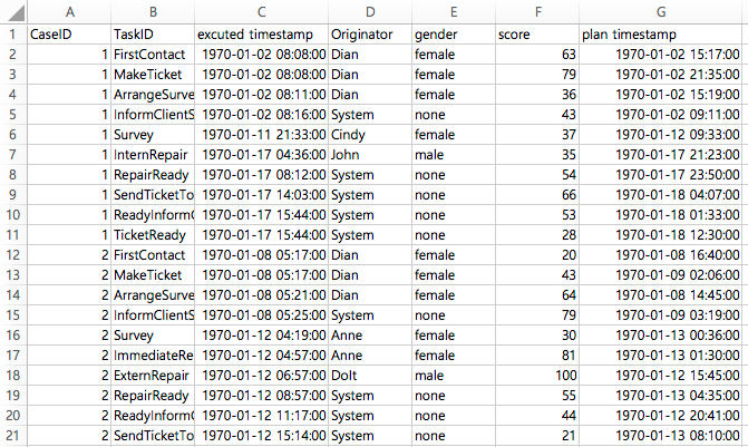 이 정보만을 가지고도 충분히 프로세스 흐름을 파악하고 그 속에서 인사이트를 얻을 수 있습니다. 하지만 쌓여가는 다른 정보들도 프로세스 마이닝 관점에서 같이 분석할 수 있다면 더욱더 다양한 양질의 분석을 할 수 있을 것입니다.