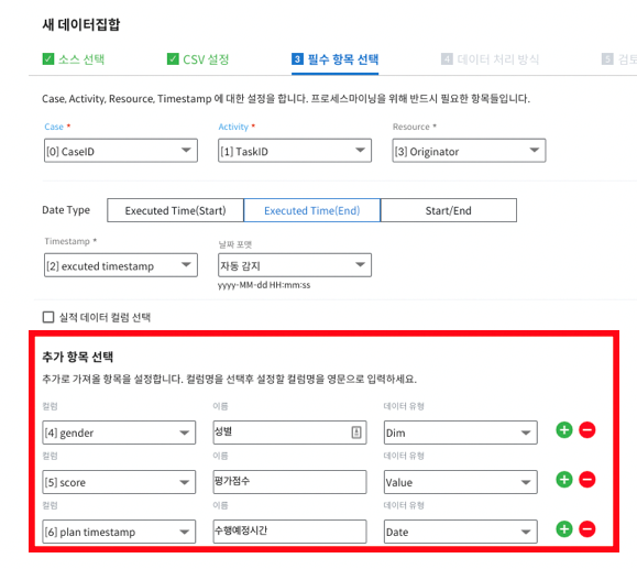 A ~ D 컬럼은 기존에 프로세스 마이닝에서 필수로 요구하는 정보들에 대한 컬럼들입니다. 여기에 추가적으로 3개의 정보 컬럼이 있습니다.
