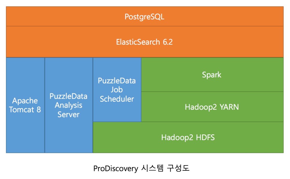 위와 같이 프로디스커버리는 빅데이터 기반의 효율적인 데이터 처리를 위해 이미 많은 사용자 및 기업에 의해 검증된 여러 오픈소스 시스템 위에 자체 개발한 알고리즘들을 적용하여 수행되고 있습니다.