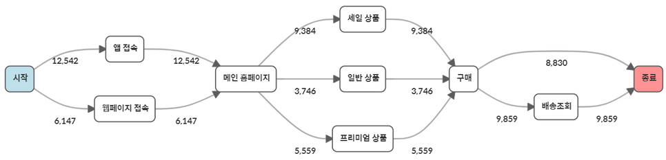 이처럼 프로세스 마이닝을 이용해 고객 로그 데이터를 분석하면 고객이 고객의 유입 경로와 홈페이지 내 고객 이동 경로를 정확하게 파악할 수 있습니다. 또한 로그 데이터에 여러 가지 속성을 결합하면 많은 전략적 시사점을 도출할 수 있으며, 이는 회사 전략을 세우는데 타당한 근거로 사용될 수 있습니다.