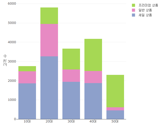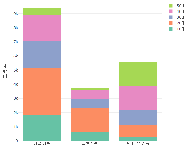 이번에 어떤 상품이 어떤 고개에게 많이 팔렸는지 확인해 보겠습니다. [그림3]은 상품별 구매 고객 수를 나타낸 그래프로 해당 상품이 얼마나 팔리는지 확인할 수 있습니다. 해당 애견 쇼핑몰은 상품을 세일 상품, 일반 상품, 프리미엄 상품으로 구분했습니다. 3가지 상품 중 세일 상품이 가장 많이 판매되었으며 일반 상품의 2배가 넘는 수가 판매되었습니다. 한편 세일 상품과 일반 상품은 20대에게 인기가 있으며, 프리미엄 상품은 40대, 50대 고객에게 잘 팔린다는 것을 확인할 수 있습니다.