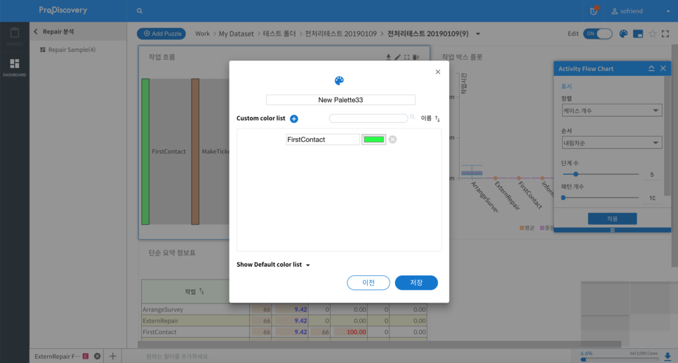 데이터 분석 중 특정 Activity의 색을 변경해서 보고 싶을 경우 색상을 지정할 수 있는 기능이 추가되었습니다. 여러 Activity들에 직접 색상을 지정할 수 있으며 이를 하나의 팔레트로 설정하여 다른 대시보드를 볼 때도 미리 만들어 둔 팔레트를 불러와 사용할 수 있습니다.