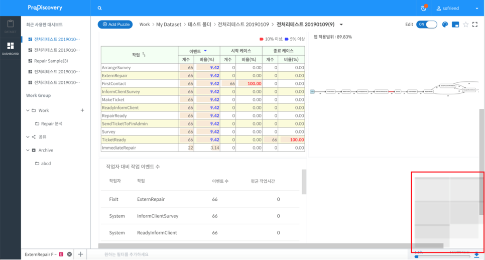 현재 대시보드 내 퍼즐들(분석 위젯)의 배치를 한눈에 확인할 수 있으며 미니맵 위의 사각 영역을 드래그해서 해당 위치로 이동 가능합니다.