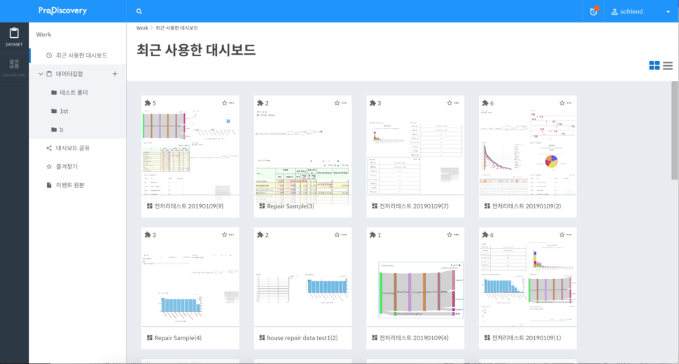 ProDiscovery의 데이터 분석은 데이터 집합을 등록한 후 대시보드를 생성하고 대시보드에 퍼즐을 등록하는 방법으로 수행하게 됩니다. 이 과정에서 많은 편의성을 개선하여 ProDiscovery 2.1로 업데이트했습니다.