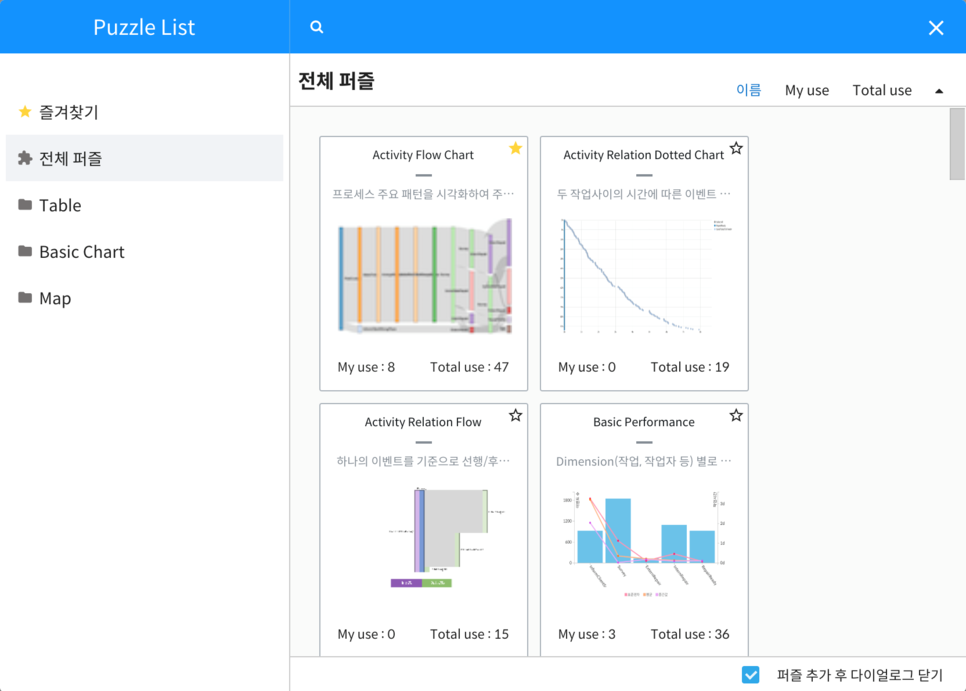 기존에 단순히 정해진 목록에서 선택했던 것과 달리 이름순, 사용 순으로 정렬해서 볼 수 있습니다. 사용순의 경우 내 사용순뿐만 아니라 전체 사용자 기준 사용 빈도로도 정렬할 수 있습니다. 또한, 자주 사용하는 퍼즐을 즐겨찾기에 추가할 수 있습니다.