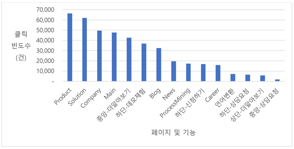 로그 분석 결과, 한 달 동안 홈페이지를 방문한 고객들은 상단의 메뉴 중 Product 페이지를 가장 많이 방문하였습니다. 그다음으로는 Solution 페이지 방문 빈도가 높았습니다.