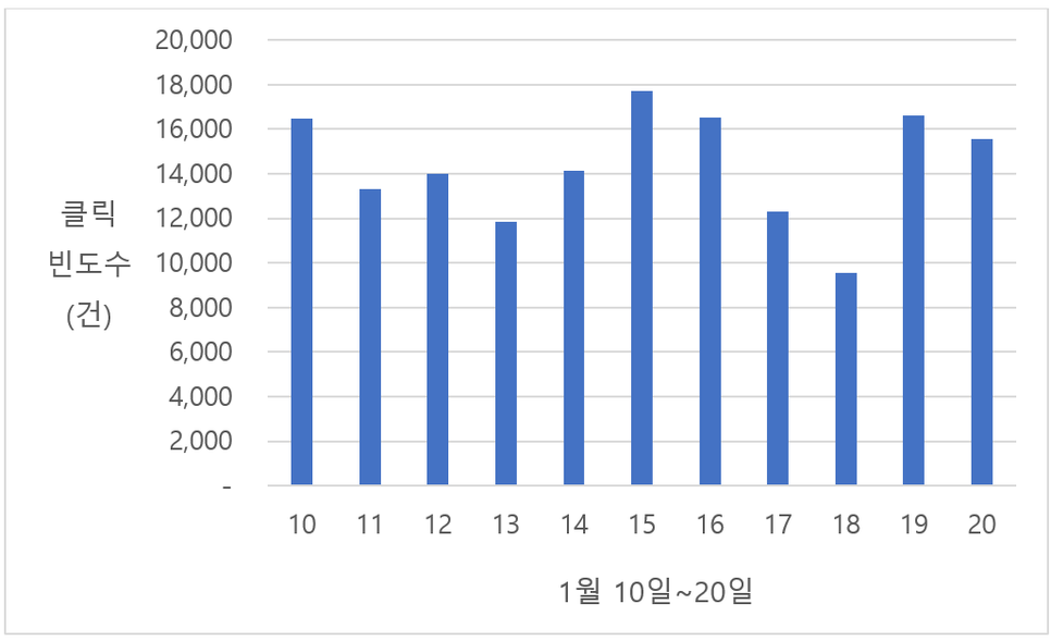 1월 10일부터 20일까지를 기준으로 일자별 웹사이트 클릭 빈도수를 확인해보면, 15일 화요일에 가장 활발한 페이지 클릭이 발생했음을 확인할 수 있습니다.