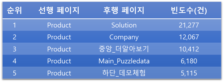 페이지 중 클릭 빈도수가 가장 높은 Product 페이지를 기준으로 선후행 관계를 살펴보면, Product 페이지에서는 Solution 페이지로의 이동 빈도가 가장 높은 것으로 나타났습니다.