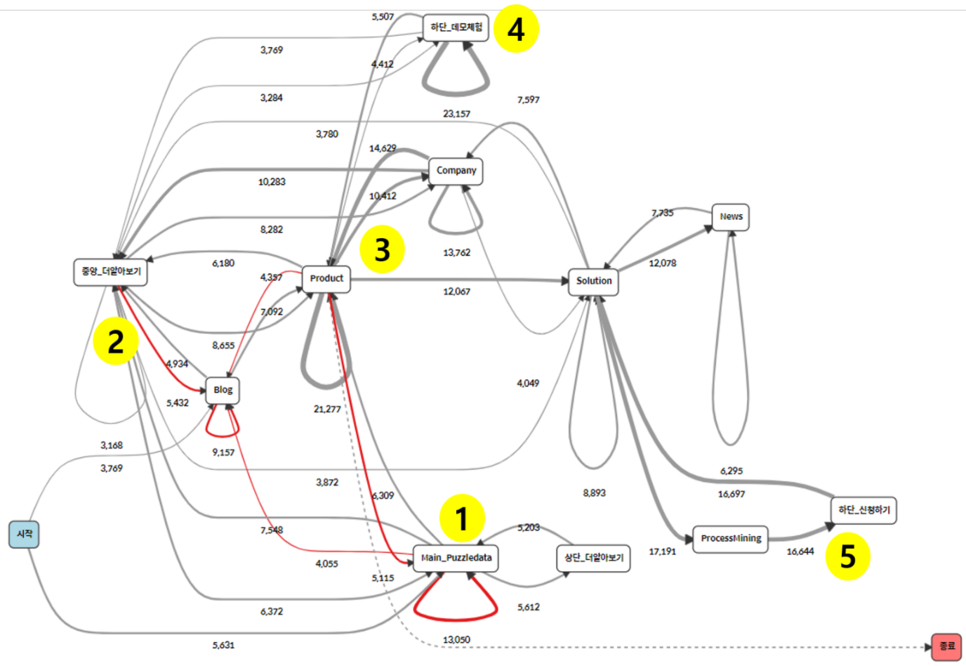 다음 이미지는 퍼즐데이터 홈페이지를 방문하는 방문객들의 여정을 시각화한 지도입니다.