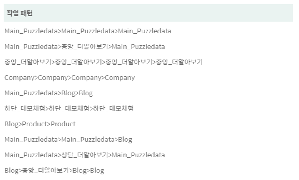또한, 한 명의 방문객이 시작부터 종료까지의 어떤 작업을 했는지 전체적인 흐름을 쉽게 발견할 수 있습니다. 그리고 방문객들이 홈페이지를 이용하는 프로세스의 구체적인 패턴 종류도 확인할 수 있습니다.