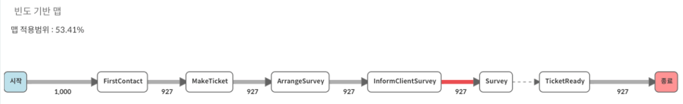 제가 가진 수리 데이터는 FirstContact – MakeTicket – ArrangeSurvey – InformClientSurvey – Survey – (생략) – TicketReady 순으로 진행되고 있는 것을 알 수 있습니다.