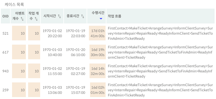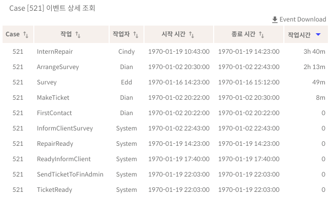 521번 케이스를 살펴보니 각각의 작업 시간은 의외로 짧았습니다. Cindy가 맡은 InternRepair 작업이 가장 오래 걸렸지만 4시간도 안되어 처리되었고, System이 처리하는 작업은 모두 1초도 걸리지 않아 처리되었습니다. 521번 케이스가 오래 걸린 원인은 작업 시간이 아니라 2일-16일-19일로 넘어갈 때 대기 시간이 문제였다는 것을 알게 되었습니다.