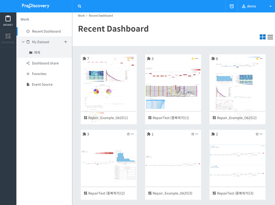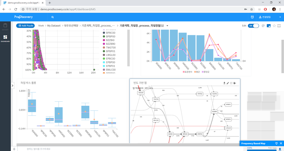 프로세스 마이닝은 이를 위해 전체 프로세스 관점에서 그 안에 담겨있는 조직, 설비, 업무, 일정, 고정 속성 등 다양한 요소들을 고려하여 통합된 업무 프로세스 모델과 관련 지표들에 대한 가시화 기능을 제공합니다.