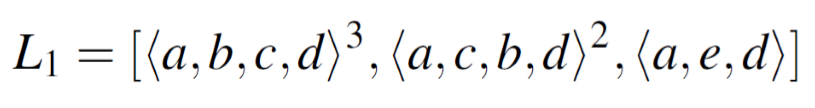 여기서 L1은 이벤트가 발생한 패턴들의 집합이라고 할 수 있습니다. 즉, L1이라는 이벤트 로그는 총 3가지 패턴(L1의 부분집합)으로 이루어져 있다고 말할 수 있습니다. 또한, 부분집합의 상단에 표시된 숫자는 해당 패턴의 발생 빈도를 뜻합니다. 정리하자면, L1은 <a-b-c-d> 패턴 3번, <a-c-b-d> 패턴 2번, <a-e-d> 패턴 1번을 이루어진 이벤트 로그입니다.