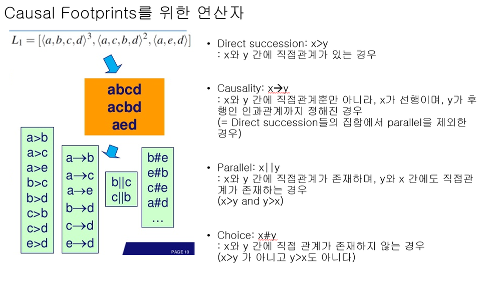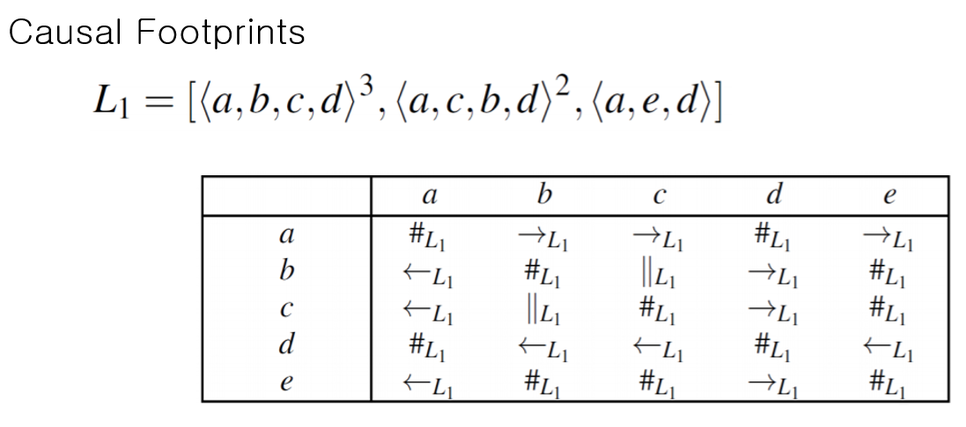 이러한 이벤트 로그를 Causal Footprints에 필요한 연산자를 적용하여 표현해보겠습니다.